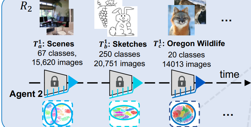 population of LL agents that each sequentially learn different tasks, with all agents operating
